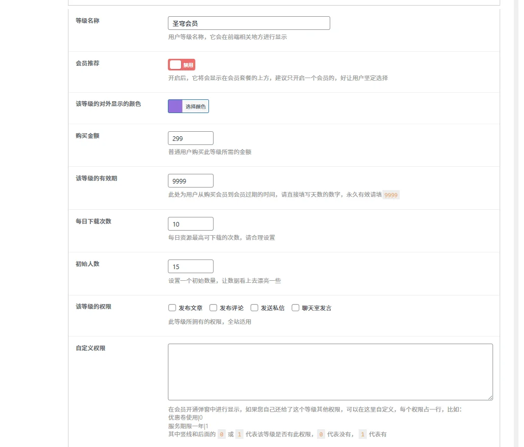 1、用户等级功能:此功能分为普通等级和VIP等级,普通等级下用户可以自主设置普通等级的名称、所需积分和等级经验,该等级的权限,发布文章、发布评论、发布私信、聊天室发言,其中当前只能使用发布私信。VIP等级同样可以自定义名称、会员推荐、等级对外显示颜色、购买金额、该等级的有效期、每日下载次数、初始人数、该等级的权限,发布文章、发布评论、发布私信、聊天室发言,其中当前只能使用发布私信。自定义权限,自己设置需要的内容,可以配合导出功能来做设置。