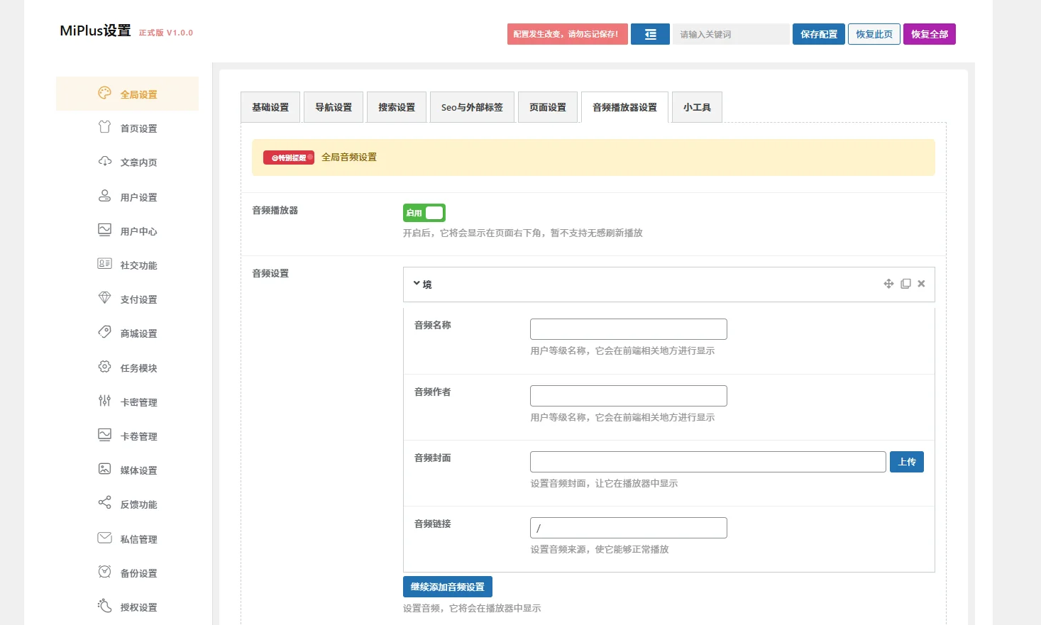 2、全局设置:可以设置网站标题、LOGO、缩略图、导航栏的布局颜色、页面看度,侧边栏宽度、小工具内容、内置了一个音乐播放器等等内容。