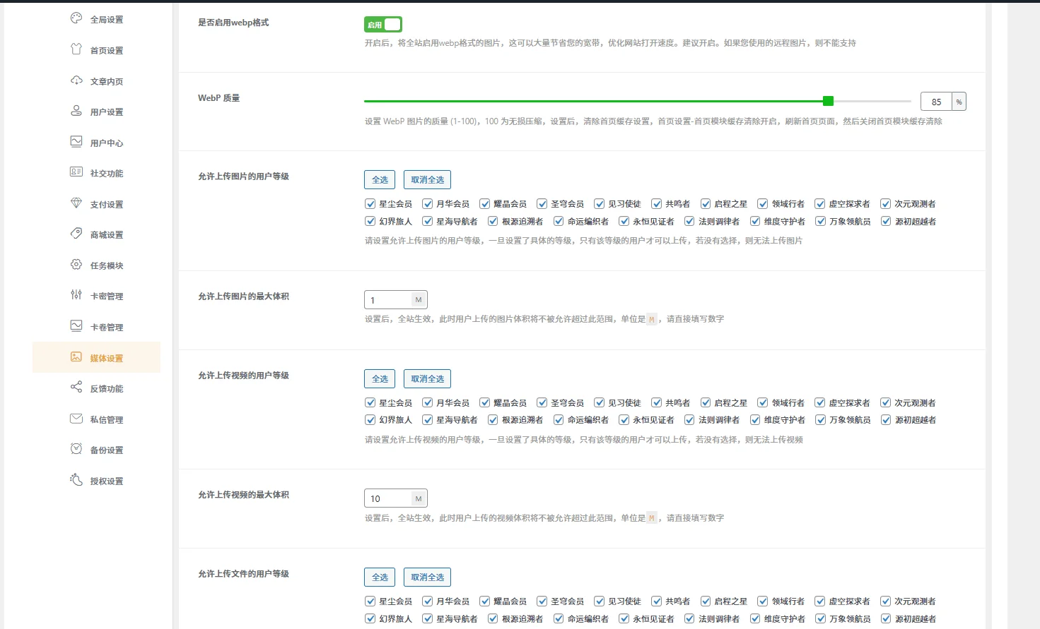 9、媒体设置:支持全站启用webp功能,开启后,图片会优先将原先的图片按照webp质量设置转为webp格式图片,支持图片上传的用户等级、上传大小,配合VIP用户自定义权限设置。