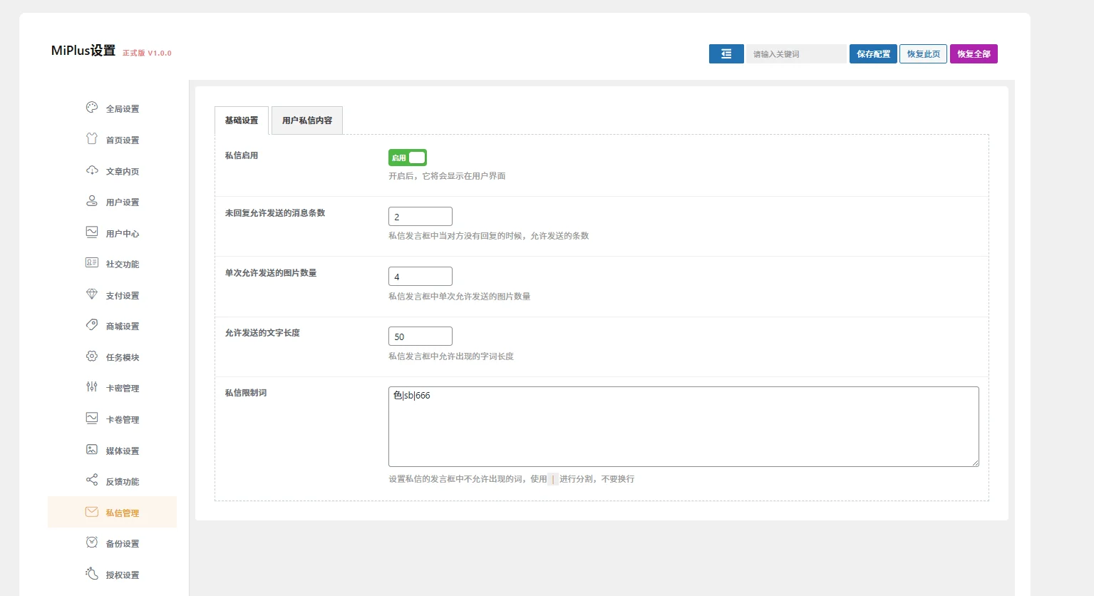 11、私信设置:支持私信启用、未回复允许发送的消息条数、单次允许发送的图片数量、允许发送的文字长度、私信限制词。